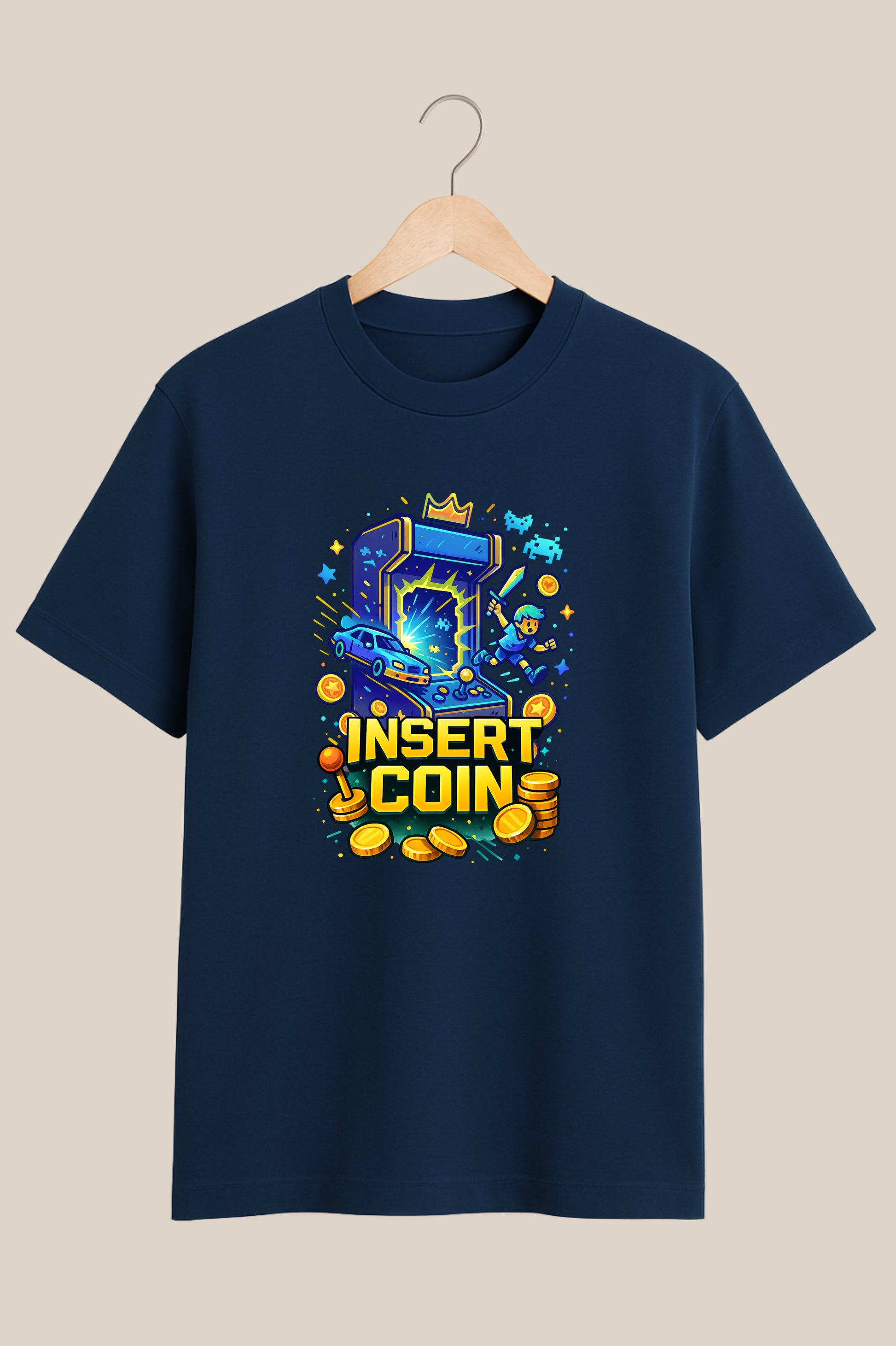 This premium oversized 100% cotton navy blue t-shirt is pure gamer nostalgia — the iconic Insert Coin design glowing like an arcade screen, transporting you straight back to joystick battles, pixelated heroes, and high-score chases. It’s a tribute to the golden age of gaming and the thrill of “one more life.”