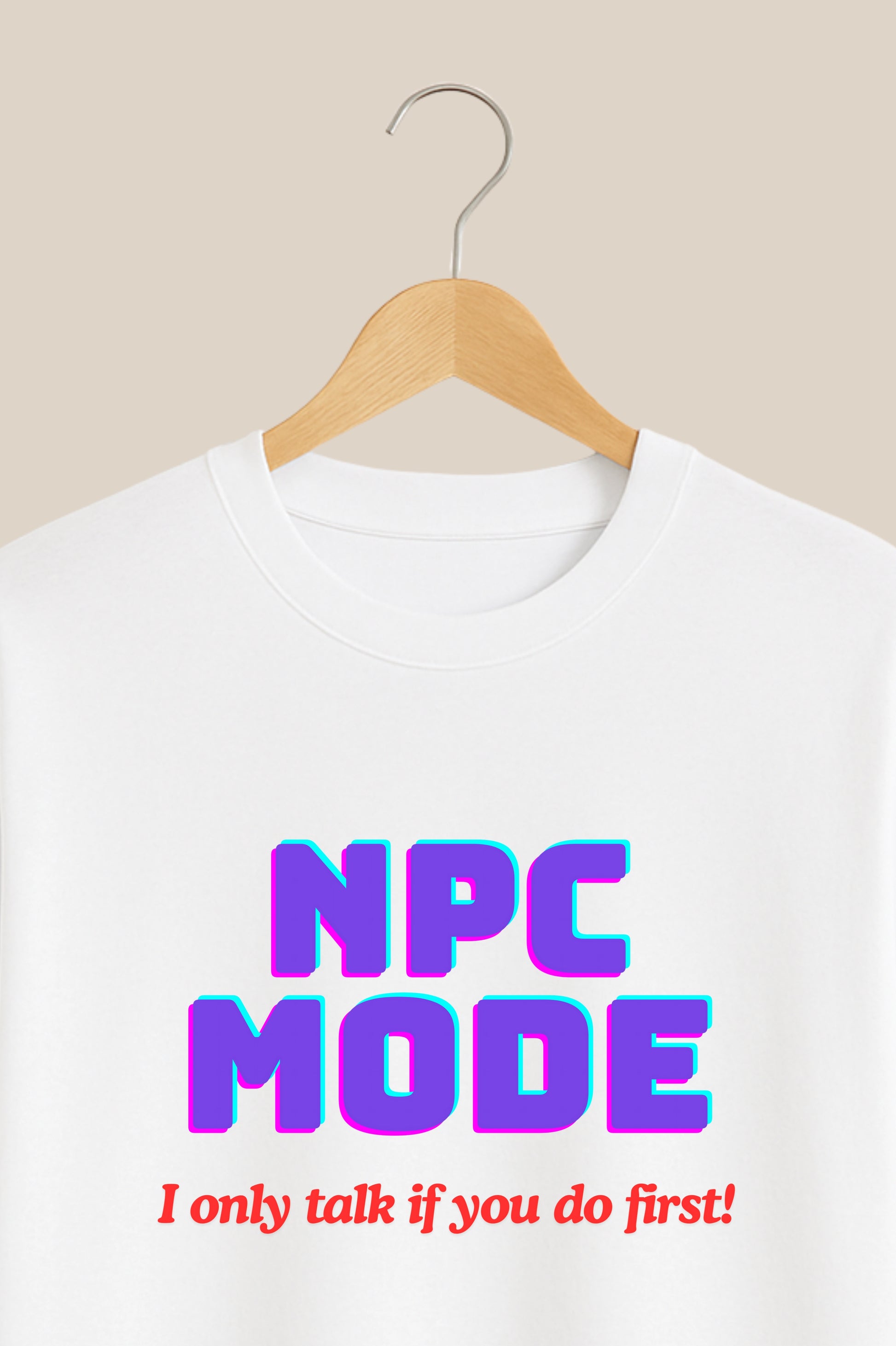 This premium oversized 100% cotton white t-shirt blends gamer culture with sharp word art design. The bold text NPC MODE is styled in retro pixel typography, with the tagline “I only talk if you do first” completing the look. It’s minimal, witty, and instantly relatable for gamers and meme lovers alike.