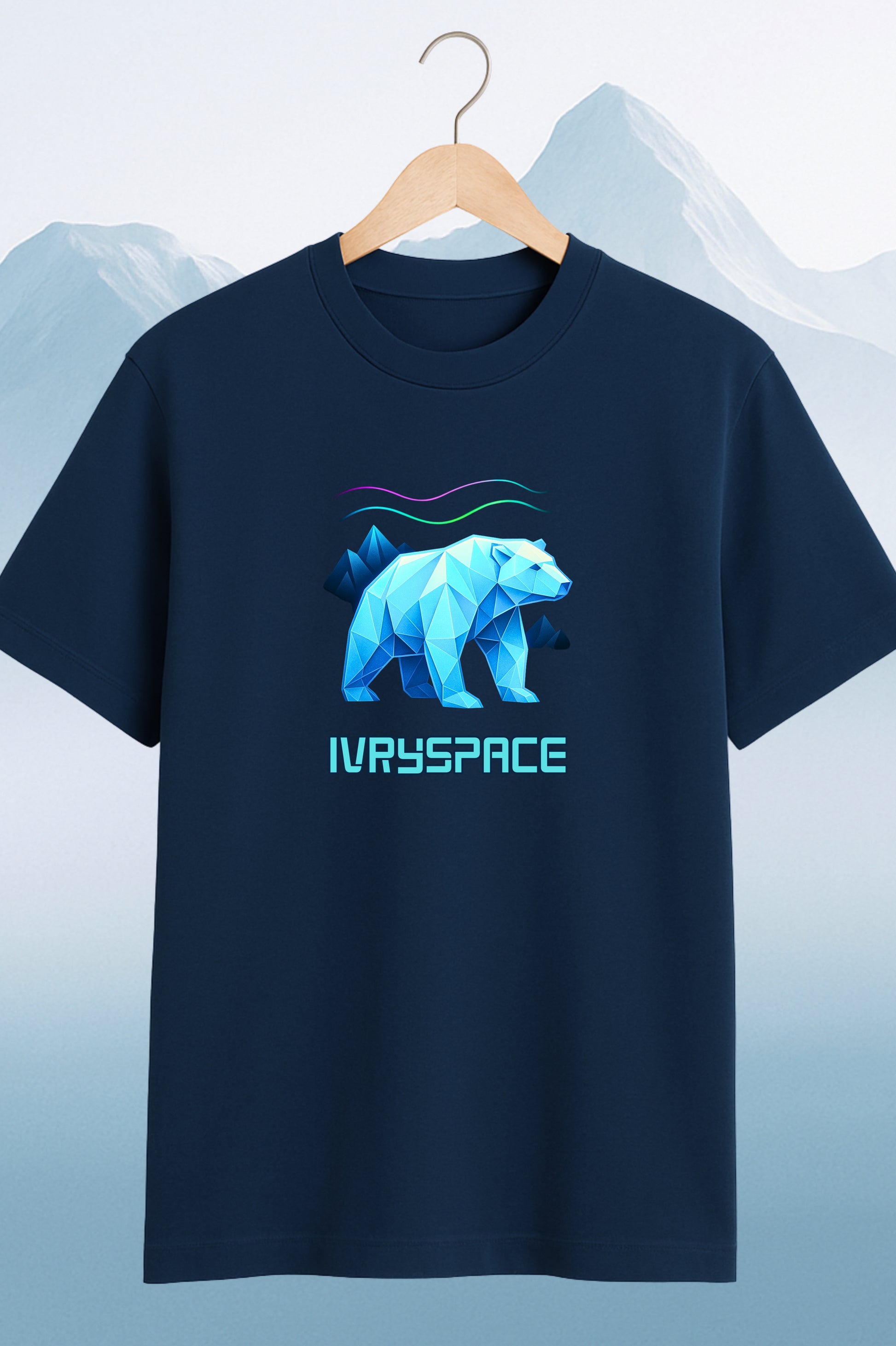 This premium oversized 100% cotton navy blue t-shirt captures Arctic wonder — a polar bear shaped in crisp origami folds, standing beneath the shimmering dance of the northern lights. It’s a fusion of nature’s purity and human artistry, a tribute to strength in serenity.