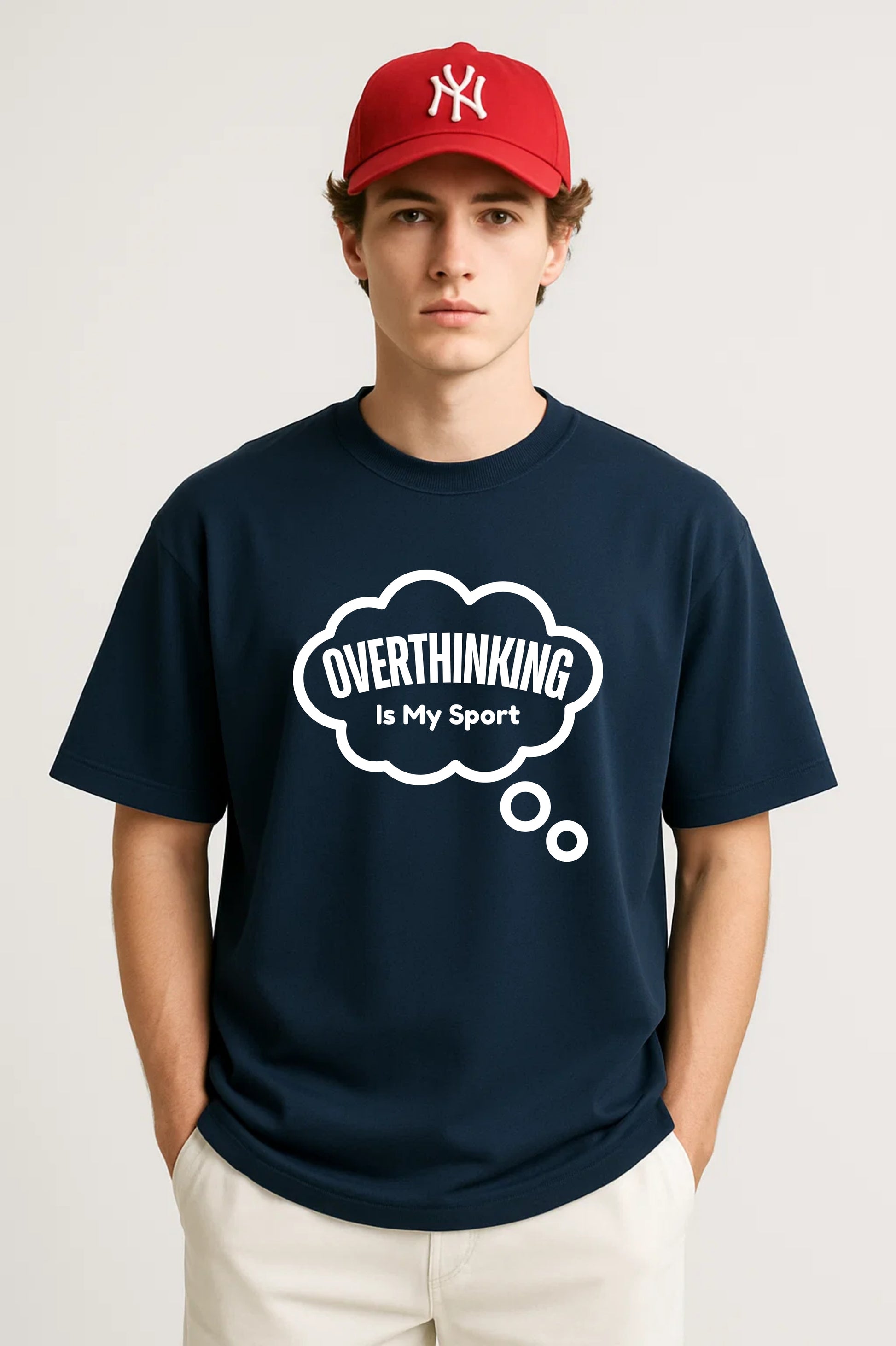 This premium oversized 100% cotton navy blue t-shirt turns everyday chaos into humor with the bold statement: Overthinking is My Sport. Designed in striking word art typography, it transforms a relatable truth into a streetwear essential — equal parts witty, bold, and stylish.